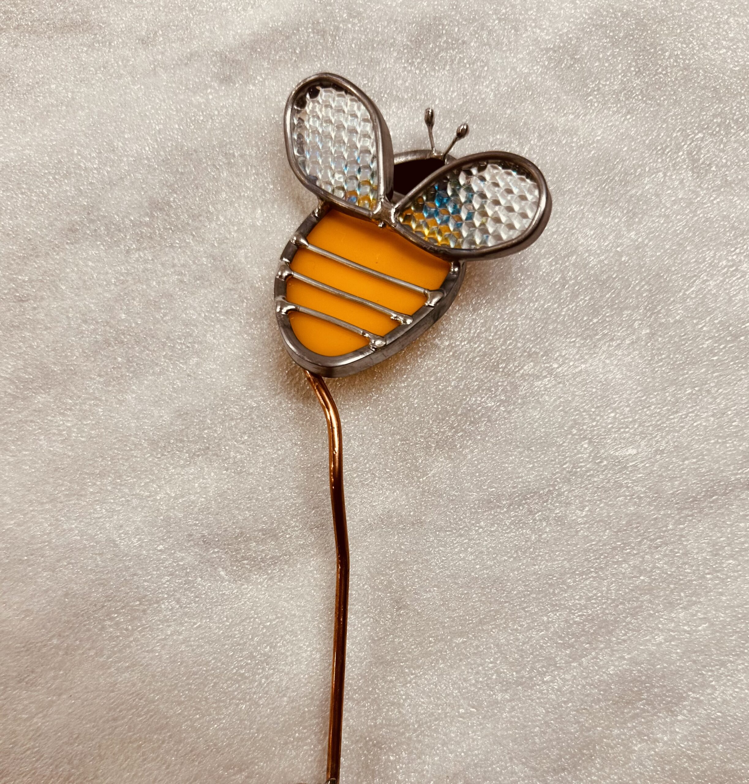 Stained glass yellow and black bee wrapped in lead came on a copper stake. H=9.75″ x W=2.5″