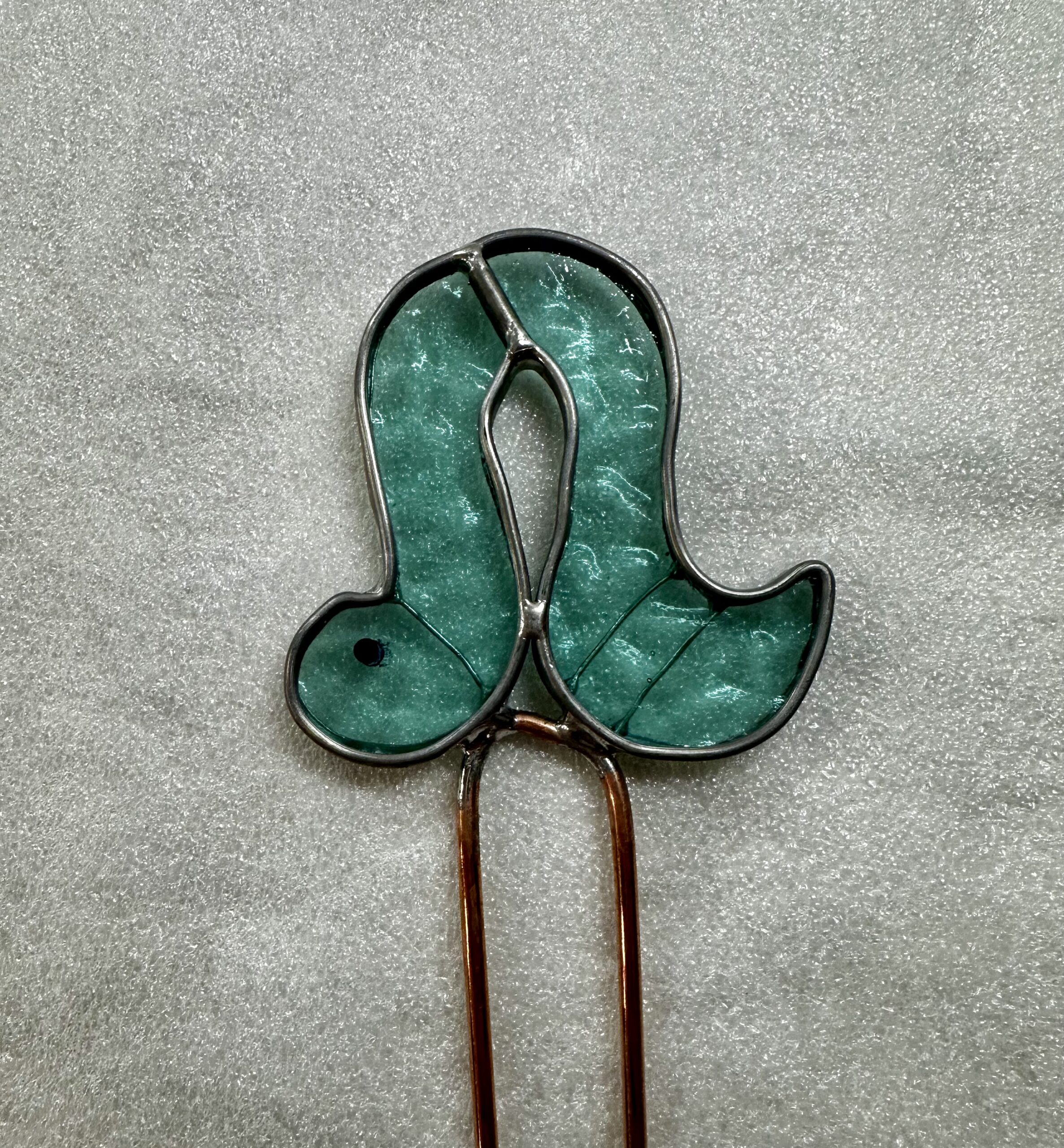 Green stained glass on a copper stake. H=8.25 x W=3″