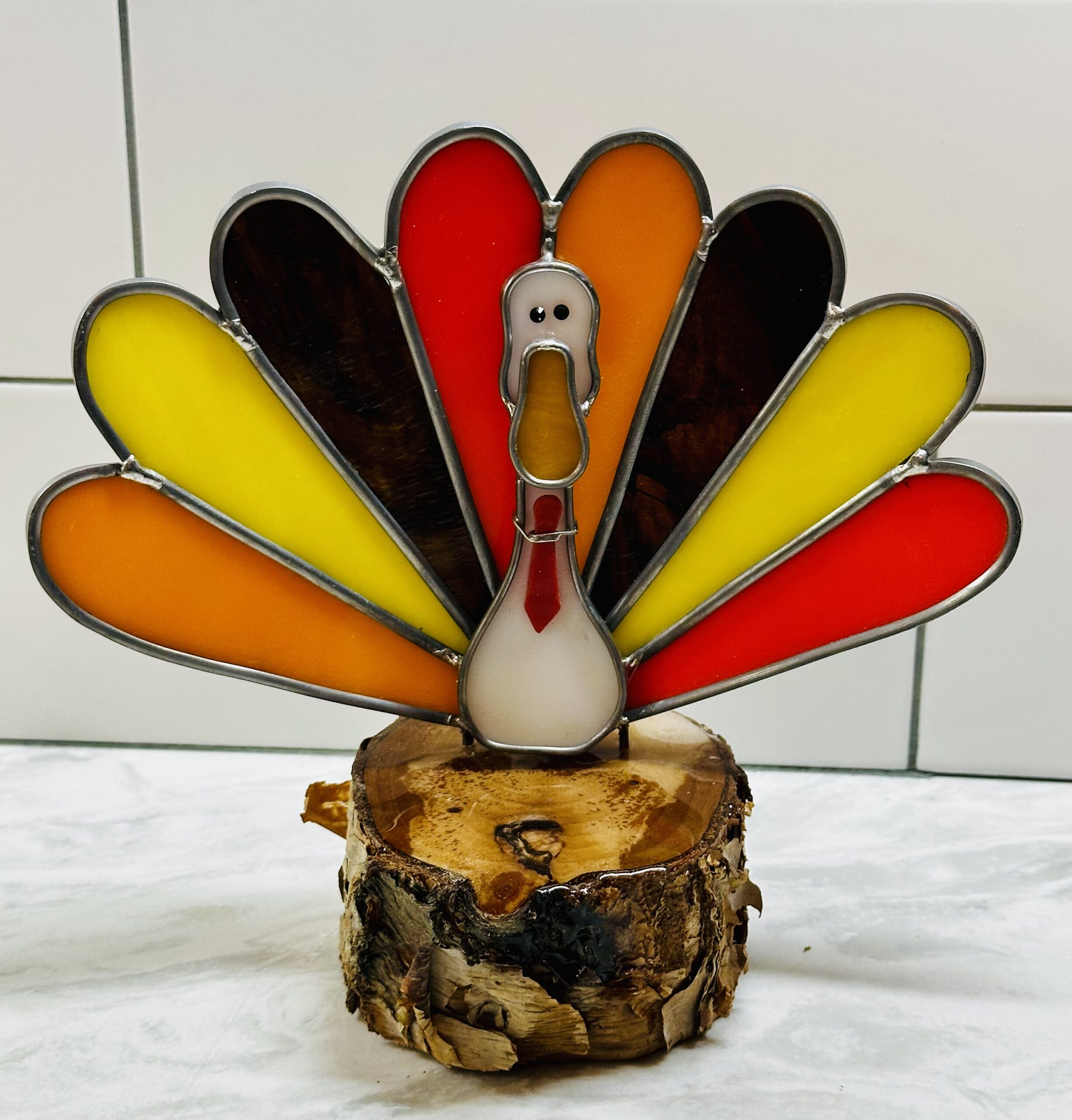 Stained glass small white duck with turkey feathers and red necktie on a resin wood base.  H=7″ x W=8″